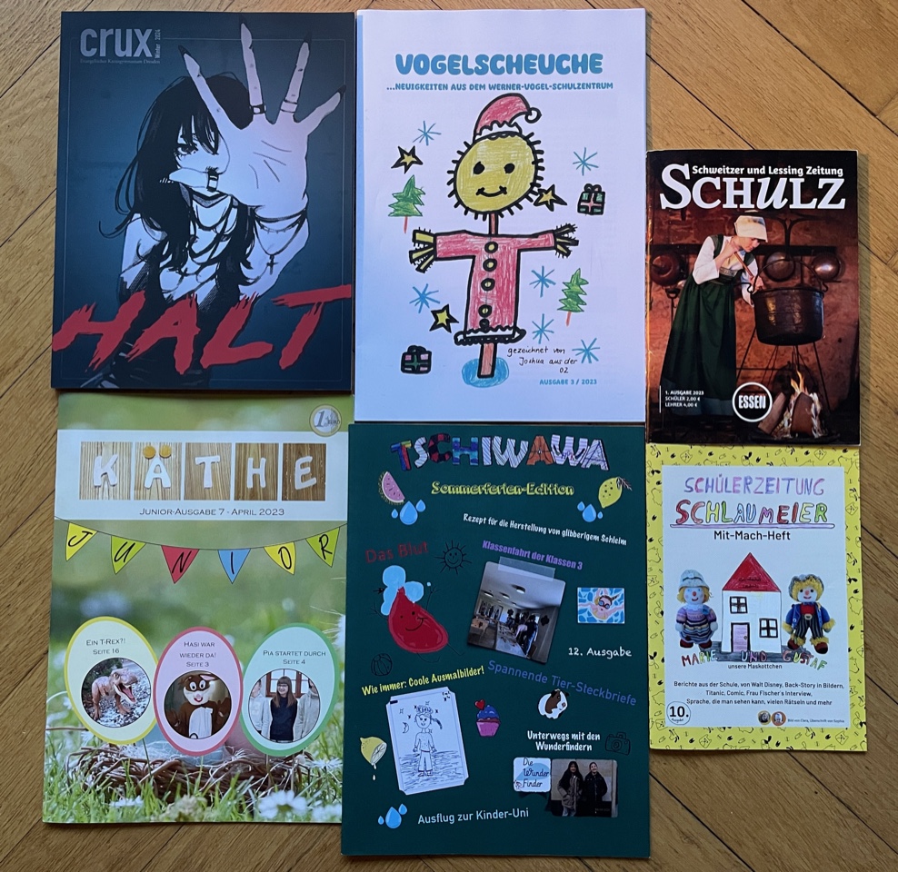 Sie heißen exotisch „Tschiwawa“ (August-Bebel-Grundschule, Leipzig), einheimisch-direkt „Schulz“ (Lessing-Gymnasium, Kamenz) oder „Käthe“ (Käthe-Kollwitz-Gymnasium, Zwickau), augenzwinkernd „Schlaumeier“ (Grundschule Leubnitz, Werdau) oder „Vogelscheuche“ (Werner-Vogel-Schulzentrum, Leipzig), manchmal auch, nomen est omen, „Crux“ (Evangelisches Kreuzgymnasium, Dresden) – in Sachsen gibt es eine gute dreistellige Anzahl aktiver Schülerzeitungen – 172 haben sich 2024 am Sächsischen Jugendjournalismuspreis beteiligt, der jährlich vom von der Jugendpresse Sachsen e. V. und dem Sächsischen Kultusministerium verliehen wird. Dabei zeigt sich: Die Sächsische Schülerzeitungslandschaft ist höchst lebendig! Das gilt fürs Erscheinungsbild – die Optik reicht hier von der handabgezogenen A5-Kladde bis zum professionell layouteten Mag mit über 100 Seiten – wie für die thematische Spannbreite: Eine Umfrage zum Lieblingsessen findet sich da ebenso wie Reportagen über Beleidigungen im Alltag oder häusliche Gewalt.