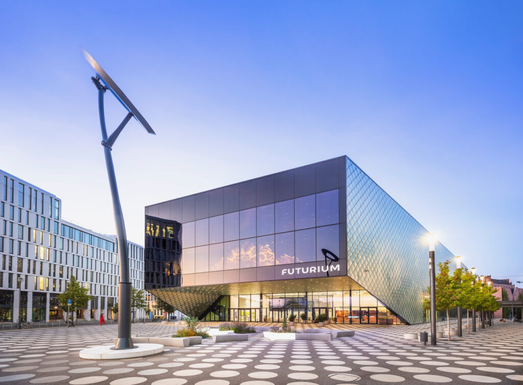 Das Futurium, gelegen zwischen Reichstag und Berliner Hauptbahnhof, direkt an der Spree, erkennt man schon aus der Ferne; mit seinen großen Panoramafenstern wirkt es wie ein kantiges Raumschiff. Tatsächlich erstrecken sich im Inneren über 3200 Quadratmeter Ausstellungsfläche auf drei Ebenen. Vom Dach des Hauses hat man eine tolle Aussicht auf Spreebogen und Kanzleramt. „Haus der Zukünfte“ ist der Claim dieses Forums für Wissenschaft, Wirtschaft und Politik – ein Plural, der Christian Engelbrecht, Referent für Bildung und Partizipation am Futurium, sehr wichtig ist: „Weil da drinsteckt, dass wir nicht das Orakel von Delphi oder irgendein Zukunftsprognose-Institut sind.“ Stattdessen werden am Futurium verschiedene Zukunfts-Szenarien in den Bereichen Energie, Demokratie, Mobilität, Gesundheit, Arbeit vorgestellt. Die Leitfrage lautet stets: „Wie wollen wir leben?“
