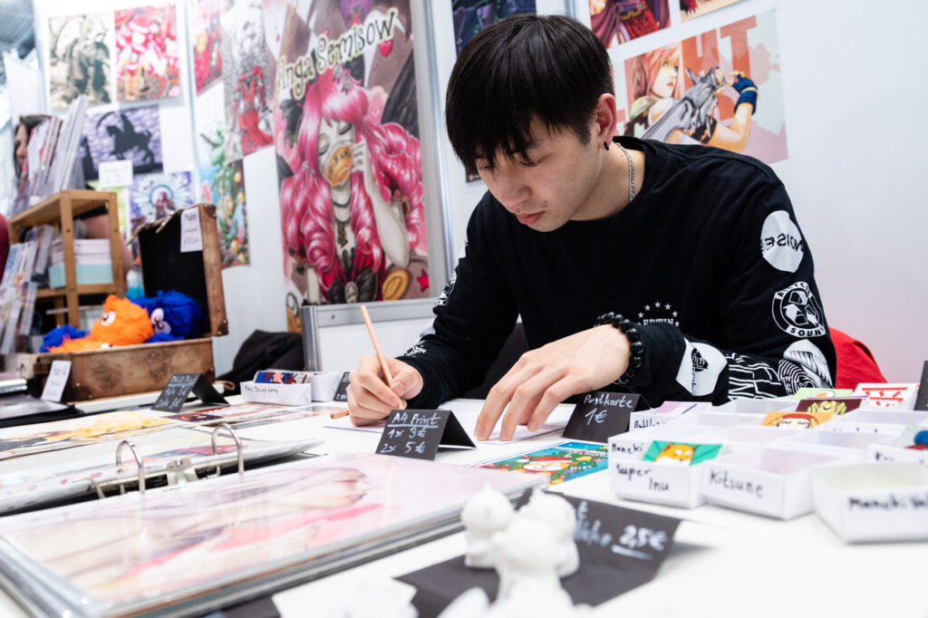Scheinhuber: Für Künstlerinnen und Künstler ist die MCC eine der wichtigsten Veranstaltungen im Jahr. Im Gegensatz zu anderen Conventions haben wir den Vorteil, dass hier auch alle relevanten Verlage ausstellen. Am Ende des Tages hat das Gros der nicht-kommerziellen Kreativen doch das Ziel, ihr Werk über einen professionellen Verlag zu veröffentlichen. Die meisten, die hier Artworks und selbstproduzierten Merch anbieten, schreiben eigene Manga oder zeichnen Comics. Hier finden sie das Publikum und die Fachplattform, die sie suchen.