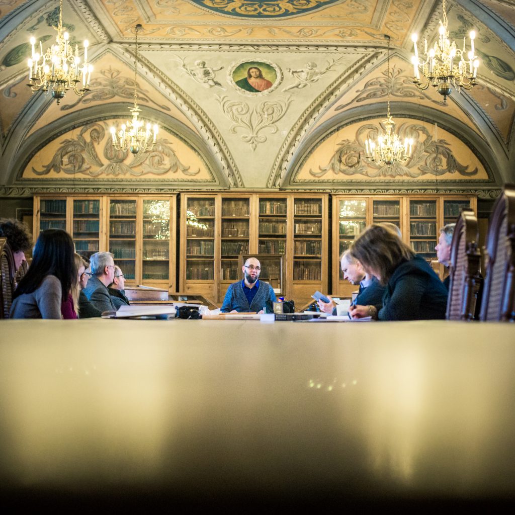 Die Gelehrtenrepublik: Der von Pranciškus Smuglevičius und seinem Bruder Antanas ausgemalte Saal ist der prächtigste der Vilniuser Universitätsbibliothek. Während uns der Dichter, Essayist und Übersetzer Laurynas Katkus auf einen fulminanten Crash-Kurs durch die litauische Literaturgeschichte mitnimmt, blicken Pindar, Sokrates, Plutarch & Co. stumm auf uns herab.