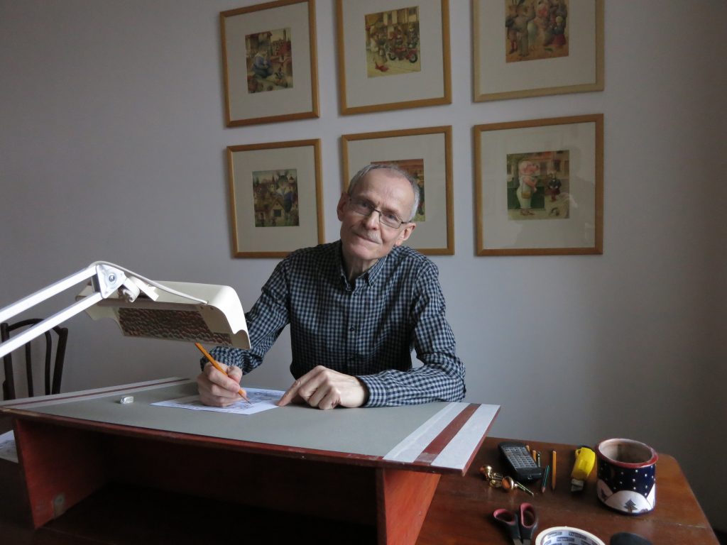 Bildnis des Künstlers als junger Mann: Die Bücher des litauischen Kinderbuchautors und Illustrators Kęstutis Kasparavičius sind in knapp 30 Sprachen rund um den Erdball übersetzt worden. Gemessen an diesem Erfolg ist der Mann, der uns in seinem Atelier in der Vilniuser Altstadt – genau dort, wo sich ehedem das jüdische Ghetto befand – mit Chrysanthemen-Tee und selbstgebackenem Kuchen bewirtet, extrem bescheiden und freundlich. An den Atelier-Wänden hängen auch die Originale der Illustrationen, die Kasparavičius einst zu Limericks von Edward Lear schuf. Und siehe da: Der skurrile Brite mit Schnurrbart und Nickelbrille trägt die Züge des Künstlers als junger Mann.