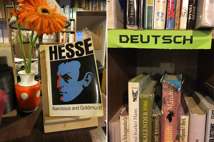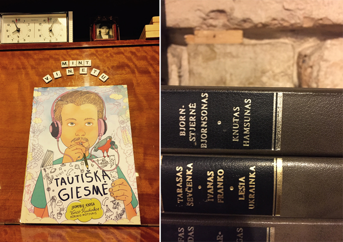 Auf dem Tresen liegen Comics und Literaturzeitschriften aus; in den Regalen finden sich nicht nur Bücher in litauischer Sprache, sondern ganze Sektionen für englische, russische, französische, spanische, italienische und deutsche Bücher. So blättern wir neugierig in einer englischsprachigen Ausgabe von Hesses „Narziss und Goldmund“ und in einer Anthologie mit litauischer Poesie aus zwei Jahrhunderten, die 1983 im Verlag Volk und Welt erschienen ist. Die Nachdichtungen stammen von namhaften DDR-Autoren wie Heinz Czechowski, Franz Fühmann oder Sarah Kirsch; der Klappentext zitiert Herders „Stimmen der Völker in Liedern“: „Das litthauische Mädchen, das von Allem ihres Hauses Abschied nimmt und die ganze Brautwelt aus ihrem Aug und Herzen mahlet, ist größere Dichterin, als der possierlichste Fabrikant einer Abschiedsrede – an der sein Pult und nichts als sein Pult klebt.“ Über 200 Jahre ist das her, die litauische Studentin am Nebentisch tippt versonnen in ihr Apple-Notebook.