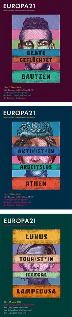 Die diesjährige dritte und letzte Auflage des Programms Europa21 sehe ich als Fortsetzung der Arbeit meiner beiden Vorgängerinnen Insa Wilke und Esra Kücük. Aufbauend auf der Frage nach dem Wir in Europa vom letzten Jahr, möchte ich gemeinsam mit den Teilnehmern und den Gästen der Leipziger Buchmesse diskutieren, ob wir in Europa wirklich die besten sind und unsere Vorstellungen von Gesellschaft, Politik und Wirtschaft weltweit exportieren sollten. Ich setze in der Auswahl der Streitenden stärker auf gegensätzliche Meinungen, auf die Vielfalt der europäischen Stimmen. Auf das Künstlerduo Various & Gould und ihre plakative Auseinandersetzung mit Identität und Klischees freue ich mich besonders. Dank der Plakate Identikits können wir auch die Leipziger und ihre Gäste im Stadtraum in den Denk-Raum miteinbeziehen und hoffentlich zum Nachdenken anregen. Ich bin sehr gespannt auf die kommenden Messetage und freue mich sehr auf den Austausch.