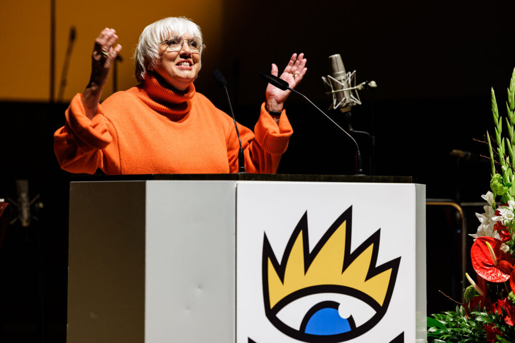Claudia Roth, Staatsministerin für Kultur und Medien, möchte am liebsten den ganzen Saal umarmen („liebe alle!“), ist sichtlich gerührt vom Moment und darf sich qua Amt auch einmal selbst zitieren:„Ich lasse mir diese Buchmesse nicht wegnehmen – um alles in der Welt nicht!“ Dieser Schlachtruf war der meistzitierte Satz eines „Zukunftsgesprächs“ zur Leipziger Buchmesse vor Jahresfrist – und selbst wenn jemand damals Diebstahls-Absichten gehabt hätte, hätte er sich anschließend gewisslich nicht mehr getraut.