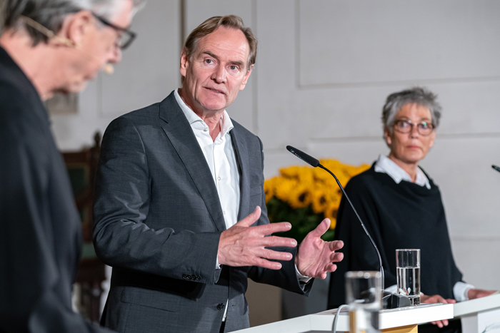 Statt der im Gewandhaus üblichen Reden schaltet die Regie der Vergabe-Prozedur eine Art Talk-Format mit den Repräsentanten der Preis-Stifter vor – Börsenvereins-Vorsteherin Karin Schmidt-Friderichs, Sachsens Ministerpräsident Michael Kretschmer und Leipzigs OBM Burkhard Jung. Das ist richtig und mutig gedacht, profanisiert den festlichen Moment allerdings auch ein wenig, so als würde Anne Will aus einer Kirche gesendet. Einiges hallt nach, etwa ein Gedanke von Karin Schmidt-Friderichs, die gefragt wird, welche Fehler beim Neustart nach der Pandemie möglichst nicht passieren sollten. Die Börsenvereins-Vorsteherin redet Klartext: „Wir reagieren schnell über, und wir pflegen im Moment nicht zur Genüge den intellektuellen differenzierten Diskurs, für den unsere Branche eigentlich steht und stehen sollte. Wir müssen eine neue Gesellschaft verhandeln – aber nicht mit Buzzwords auf Twitter. Wir müssen uns wieder in die Augen schauen, miteinander statt übereinander reden.“ Von wem sollte so eine Diskussion ausgehen, wenn nicht von der Buchbranche? Und von wo, wenn nicht von Leipzig aus?