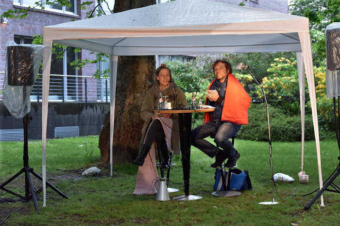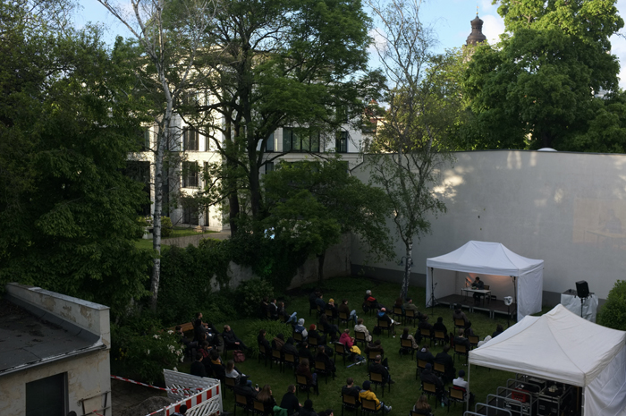 Wir machen das hier wirklich: Wer eine Open-Air-Lesung mit fast 30 Beteiligten bei historisch schlechtem Wetter, während einer Pandemie und laufenden Sanierungsarbeiten veranstaltet, braucht „gute Nerven und Unterstützung.“ So begrüßt Jörn Dege, Geschäftsführer am Deutschen Literaturinstitut Leipzig (DLL), am ersten Abend von „Leipzig liest extra“ die knapp 130 Gäste im Garten der Wächterstraßen-Villa. „Wir machen das hier wirklich“, staunt Dege – was nicht zuletzt an der Unterstützung durch Neustart Kultur und den Sächsischen Literaturrat liegt. Bei so viel Goodwill hat auch der Himmel ein Einsehen: Es bleibt trocken, vereinzelte Sonnenstrahlen werden gesichtet.