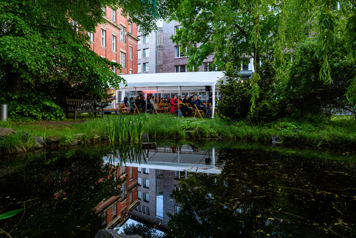 Überhaupt hat das Literaturhaus für die Woche Ende Mai geplant, als sei Buchmesse – und dabei auf seinen womöglich schönsten Raum, den Garten, gesetzt. Im Vorfeld wurden Zelte, Decken und Kissen angeschafft – doch als am Mittwoch Judith Hermann und Gregor Sander starten, setzt es einen dreistündigen Wolkenbruch. „Das ist kein Regen mehr, das ist ein Terroranschlag“, sagt Literaturhaus-Chef Thorsten Ahrend, der als Mecklenburger einiges abkann. Der Regen trommelt ohrenbetäubend aufs Zeltdach, das schon bald bedrohlich durchhängt, Publikum und Autoren pushen sich gegenseitig. Für fast jeden, der hier auf die Bühne geht, ist es eine Buchpremiere nach sehr langer Zeit. Der Judith-Hermann-Abend ist „die verrückteste Lesung meines Lebens“ gewesen, findet Ahrend. Alles in allem sind in vier Tagen 40 Autorinnen und Autoren zu Gast, darunter eine prominente Abordnung aus Portugal und Sandra Gugić, Shpëtim Selmani und Tijan Sila für das Südosteuropa-Programm „Common Ground“.