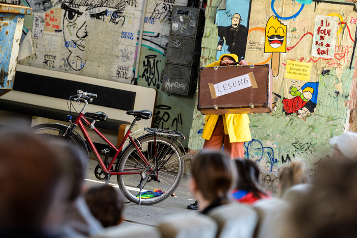 Sechs Richtige: Miriam Zedelius, 1977 in Heidelberg geboren, heute mit ihrem Mann und drei Kindern in Leipzig lebend, traut sich was. Nach ihrem Grafikdesign- und Illustrations-Studium in Leipzig, Halle und dem spanischen Granada gründete sie 2007 die Ateliergemeinschaft „Mischkomplott“ in den Räumen einer alten Tischlerei. Dort schreibt und zeichnet sie, entwirft Plakate und Buchcover, unter anderem für den Poetenladen. Unter dem Titel „Lotte und die Freitags-Oma“ (Hummelburg) erschienen Anfang des Jahres 18 neue Vorlesegeschichten für kleine Menschen ab vier, die Zedelius selbst zweifarbig illustriert hat. Genau der richtige Stoff in Pandemie-Zeiten. Und nun? Für Leipzig liest extra hat Miriam Zedelius nicht nur schnöde vorgelesen, sondern ihr Buch auf die Open-Air-Bühne der Feinkost gebracht – genau vis-á-vis der wunderbaren Kinderbuchhandlung Serifee! Und was liegt näher, als eine LOTTErie mit coolen Gewinnen ganz in echt, wenn die Heldin des Buchs schon Lotte heißt? Da schnappt sich so manche Freitags-Oma die Enkel und wird, zack! zur Sonntagmorgen-Oma.