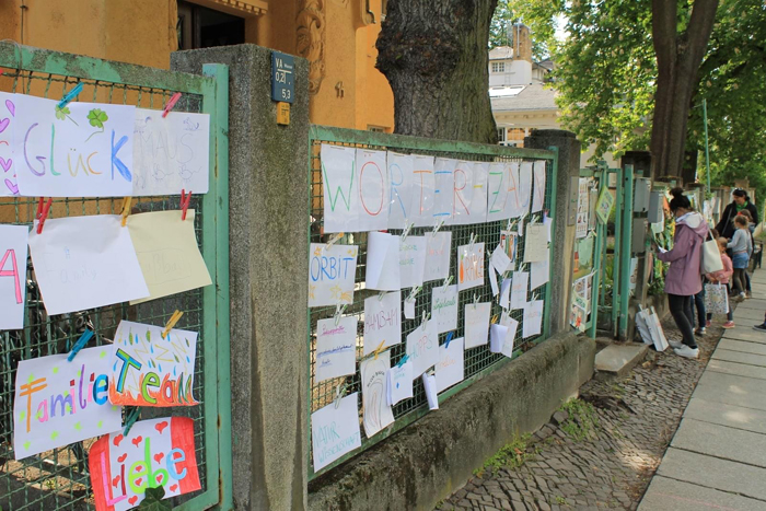 Klett Kinderbuch lädt also zu einer kleinen, feinen Zaunmesse „to go“ ein – eigentlich für Donnerstag und Freitag, doch das leicht sibirische Wetter am Donnerstag machte einen Strich durch die Rechnung. Am Freitag allerdings zeigen sich pünktlich 14 Uhr erste, vorsichtige Sonnenstrahlen. Am Zaun der gelben Villa in der Leipziger Südvorstadt gibt es eine improvisierte Ausstellung mit Bildern und Büchern aus dem aktuellen Programm, dazu nette Zaun-Gespräche. „Darum geht’s uns ja“, sagt Osberghaus, „wir wollen unsere Leserinnen und Leser, die Kinder, endlich mal wiedersehen – so wie sonst am Messestand“. Und noch etwas hat sich der Verlag für seine kleinen Fans ausgedacht: Alle Kinder sind eingeladen, Wörter gegen Wörter zu tauschen. Alles, was man tun muss: Sein Lieblingswort – egal, ob ausgedacht oder wirklich gern benutzt – auf ein A-4-Blatt schreiben und an den Wörterzaun pinnen. Im Gegenzug gab’s wortreiche Überraschungstüten für alle. Gibt es Kinder, deren Lieblingswort „Naturwissenschaft“ oder „Gesundheit“ ist? Den schlauen Professor Drosten würde das freuen. Die Verlegerin hält es – wir haben so etwas schon vermutet – eher mit Wort-Findungen wie „Großbrand“ oder „Schlabberpumpe“.