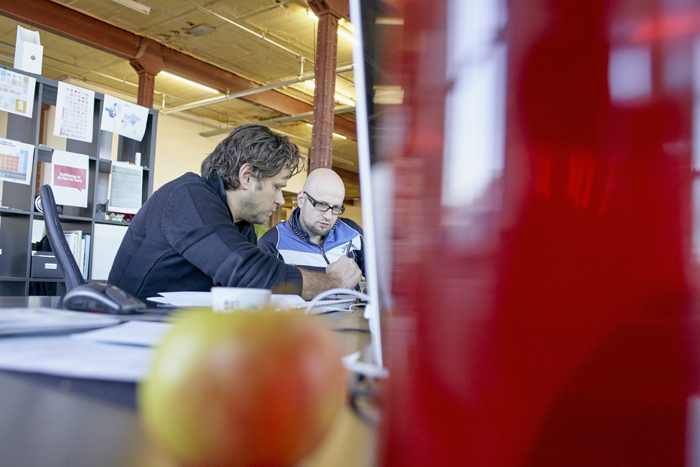 Zwischen den Nachwuchs-Düsentriebs in der Spinnerei wirkt einer wie Hendrik Schulze fast wie ein alter Hase. Zwei Firmen hat der Leipziger bereits erfolgreich zum Fliegen gebracht; die letzte zählte hundert Mitarbeiter, als sie von einem Technologiekonzern übernommen wurde. Eigentlich wollte Schulze dann ein Sabbatjahr einlegen, doch irgendwann juckte es ihm wieder in den Fingern. Zusammen mit seinem ehemaligen Entwicklungsleiter gründete er im letzten Sommer Vizzlo, das jüngste Baby. Schuld waren am Ende wohl die vielen Präsentationen, die Schulze als Firmenchef erarbeiten musste: „Ein Zeitkiller! Du steckst irrsinnig viel Aufwand in die Grafiken, während es eigentlich um den Inhalt geht.“ Die Online-Plattform Vizzlo soll das ändern: Mit ihrer Hilfe können Nutzer in weniger als einer Minute hochwertige Geschäftsgrafiken in ihre Programme integrieren – Weltkarten, Wachstumskurven, Meilensteinpläne. Was als Fingerübung begann, wurde zum Selbstläufer; bereits in den ersten drei Monaten nach der GmbH-Gründung akquirierte das Start-up rund 2500 Kunden. Die Firma wäre auch ohne SpinLab flügge geworden. „Inzwischen würde ich es bereuen, wenn wir uns nicht beworben hätten. Es ist genial.“ Schulze, der zu DDR-Zeiten als Schüler nebenan in den Kirow-Werken seinen Unterricht in „Produktiver Arbeit“ absolvierte, liebt die alten Industriegemäuer und die inspirierende Atmosphäre zwischen Künstlern und Technik-Tüftlern. Es tut gut, die eigenen Erfahrungen mit den Jüngeren teilen zu können. Doch Schulze bekommt auch viel zurück: „Spirit, Wissen, viele praktische Geschichten. Etwa, wenn mir die Leute von knowhere schnell mal bei Google Analytics helfen – dafür würde ich zwei Tage brauchen. Es ist ein Geben und Nehmen.“