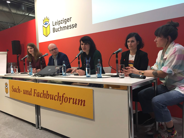 Gefragte Interviewpartnerin: Die New Yorker Autorin Masha Gessen, die zur Buchmesse-Eröffnung mit dem Leipziger Buchpreis zur Europäischen Verständigung ausgezeichnet wurde (Stefan Hoyer/punctum) | Rappelvoll: Years-of-Change-Podium zur Sprache in einer erosionsgefährdeten Demokratie mit Durs Grünbein, Kerstin Preiwuß und Marcel Beyer (Tobias Bohm) | Wie politisch ist der Buchhandel: Podium mit Karla Kutzner (Buchhandlung Interkontinental), Steffen Ille (Buchhandlung Lehmanns, Leipzig), Moderatorin Sophie Sumburane sowie Annekatrin Grimm und Daniela Weiß (Buchhandlung Montag), eine Veranstaltung im Rahmen von #verlagegegenrechts (Nils Kahlefendt) | Spezialisten aufs Podium: Die Leipziger Jugendliteratur-Jury zu Gast auf dem AKJ-Symposion (AKJ/Matthias Knoch) | Holocaust als Comic? Aber ja: Walter Famler und Rudi Gradnitzer stellen eine Graphic Novel vor, die das Leben von Primo Levi in Bilder übersetzt (Nils Kahlefendt/bahoe books) | Wettkampf der Worte: Im Forum Politik und Medienbildung ging der Democracy Slam der bpb ins Finale (Leipziger Messe/Tom Schulze) | Medienkompetenz als Voraussetzung für gesellschaftliches Engagement: Impressionen von der Werkstatt+ auf der Buchmesse (Leipziger Messe/Tom Schulze).