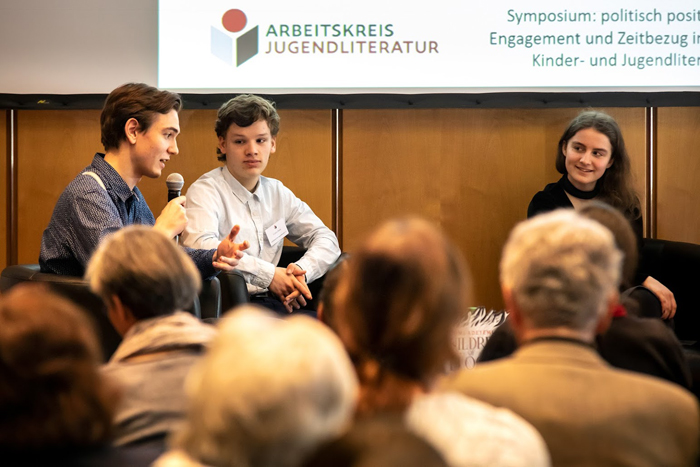 Engagierte Kinder- und Jugendliteratur: Raja, Thorben und Moritz von der Jugendliteratur-Jury der Leipziger Stadtbibliothek sind sehr wortgewandte und höfliche Teenager. Doch dass sie Tomi Adeyemis „Children of Blood and Bone“ (S. Fischer), eine Fantasy-Geschichte mit ausschließlich schwarzen Protagonisten, nicht so cool finden, wird rasch deutlich. Dabei räumt das Buch, das 52 Wochen auf der New-York-Times-Bestsellerliste stand, endlich mal ordentlich divers mit dem euro-zentristischen Blick auf. Der Auftritt der jungen Experten war Teil des traditionellen AKJ-Symposion, das diesmal unter dem Motto Politisch positioniert! Engagement und Zeitbezug in aktueller Kinder- und Jugendliteratur stand. Spannend war eine abschließende Diskussionsrunde, die nachfragte, inwieweit Engagement und kritischer Zeitbezug auf dem Kinder- und Jugendbuchmarkt durchdringen. „Wenn ich Sachen von Manja Präkels oder Birgit Weyhe lese“, so der 3sat-Redakteur Michael Schmitt, „häuft sich ein immenser Reichtum an Details an – da brauche ich keine These mehr. Bücher sollten nicht Trends nachlaufen, sondern selber Themen setzen!“