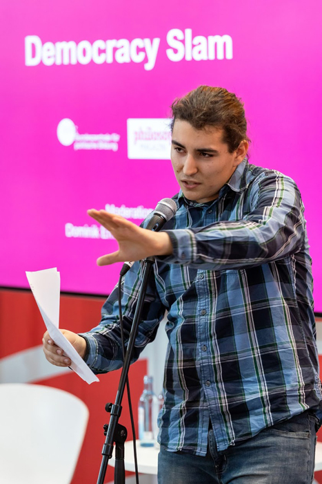Wettkampf der Worte: Heißt „Respect the Poets“ nun „Rettet die Polarklappen“, wie die flapsigen Moderatoren und Profi-Slammer Dominik Erhard und Malte Roßkopf nahelegten? Egal, im Forum Politik und Medienbildung ging am Messefreitag das Finale des von der Bundeszentrale für politische Bildung (bpb) und der Leipziger Buchmesse initiierten Democracy Slam über die Bühne. Die Vorbereitungen für das bei Jugendlichen beliebte Format, das sich vom Poetry Slam ableitet, liefen 2019 im Vorfeld der Buchmesse an verschiedenen Schulen und Bildungseinrichtungen. Unter Anleitung erfahrener Slammer entwickeln Kinder und Jugendliche in Workshops eigene Texte, die sich um Gerechtigkeit, Diversität, aber auch Ausgrenzung und Fremdenfeindlichkeit drehen. Die zehn besten Texte wurden dann live auf der Buchmesse vorgetragen.